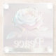 This coaster features a pretty single rose as the central focus. The rose features gradients of white, pink and blue petals, accented by luxe reflective gold metallic edges that catch the light. Emerging from a slender, golden stem, the rose curves while its leaves are adorned with gold and white geometric patterns, angled to emphasize the vibrant hues of the bloom, positioned above the white gold trimmed word Peace in white felt, illuminated with soft white accents and resting on a polished metallic gold plinth on a metallic pink background. Diffused lighting gently washes the scene, creating a dreamy, spiritual ambiance that highlights the delicate details and opulent textures of the rose and its surrounding elements. The coaster is a square glass coaster. The glass coaster is dishwasher safe.
