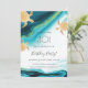 This beach themed birthday invitation features gold tribal turtles on an white teal gold ink background and a custom text in a modern artistic font and an elegant handwritten script.