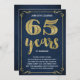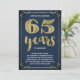 This swanky, stylish 65th wedding anniversary party invitation features vintage typography, elegant flourishes, brush script calligraphy, faux gold foil, and a chic navy blue background.