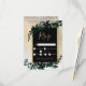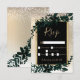 A modern, chic and elegant yellow gold typography Floral green Christmas winter rsvp wedding with hand painted green watercolor leaf foliage on an elegant gold background with white snow and snowflakes..