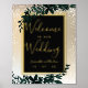 A modern, chic and elegant gold typography Floral green watercolor Christmas winter wedding welcome sign with hand painted green watercolor leaf foliage on a chic yellow gold gradient with white snow and snowflakes with real gold foil.