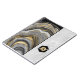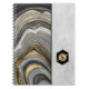 Vibrant gold veins create a dramatic contrast to the rich black and grey tones of the agate pattern which sits beside a beautifully textured silver background. A black and gold geometric frame set on the silver side of the modern-looking notebook draws your eye to the monogram initial, which you can quickly change on the Personalize template.