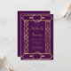 This elegant vintage-inspired wedding invitation features gold-coloured text on a purple background, framed by a stylish vintage geometric art deco border in faux gold foil. The reverse side is solid purple.
