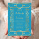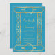 This elegant vintage-inspired wedding invitation features gold-coloured text on a turquoise background, framed by a stylish vintage geometric art deco border in faux gold foil. The reverse side is solid turquoise.