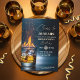 A modern design featuring a gold whiskey glass with burning fire, sparks and ice and elegant calligraphy on a dark blue background. Customize the details for a cool Birthday Celebration.