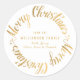 Merry Christmas is written in a large ornate script and used as a frame or wreath to surround your family name and first names. Your family name is written in a gold block text. Your first names are written in a smaller gold script font. Beautiful way to seal your Christmas card envelope.