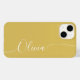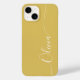 Gold White Elegant Calligraphy Script Custom Personalized Name iPhone 14 Smart Phone Cases features a modern and trendy simple and stylish design with your personalized name in elegant hand written calligraphy script typography on a gold background. Designed by ©Evco Studio www.zazzle.com/store/evcostudio