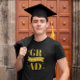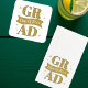 Gold and white graduation with class year inside a banner ribbon and decorative star accent.