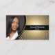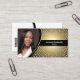 This card design front features a gold and white spiral number background with a photo placeholder on the left and template name and title on the right. The back includes a QR code, coordinated design and colours, and text fields for the business name and details. Replace the placeholder photo with your vertical format photograph and your link for the QR Code. Use the QR code to send potential customers to referrals, photographs or another business oriented page. Fill in the template fields or edit using the design tool to select a font style, size, and colour you like. The placeholder photo is courtesy pixabay.com.