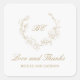 Elegant wedding favour stickers featuring a clean and timeless design with your monogram inside of a wreath crest along with the message "love and thanks" and your names.