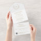 Elegant all in one wedding invitation featuring a clean and timeless design with your monogram inside of a wreath crest. Use the template to generate a QR code on the attached RSVP card.