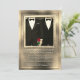 Golden and gay wedding invitation with the couple holding a red rose.