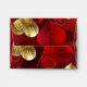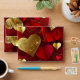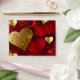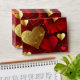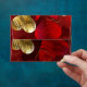 Vertical composition of red and gold, textured valentines made of foil and brocade on red background. Valentines day decorations.