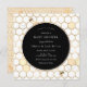 Bee-themed gold baby shower invitation featuring a gold honeycomb pattern and buzzing bees. Personalize with your information or click "Click to customize further" to edit font styles, size and colours.
