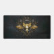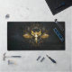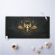 Artistically drawn, symmetrical, composition of black and gold, bird wings, golden, bird skull decorated with gilded pattern on dark, textured background.Gothic style