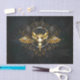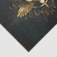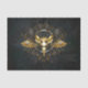 Artistically drawn, symmetrical, composition of black and gold, bird wings, golden, bird skull decorated with gilded pattern on dark, textured background.Gothic style
