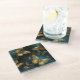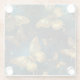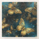 An elegant glass coaster with a butterflies pattern in glittering golden hues and glowing blues.