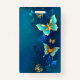 Flying gold, jewellery butterfly on blue textural background. Design with butterflies.