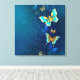 Flying gold, jewellery butterfly on blue textural background. Design with butterflies.