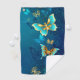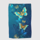 Flying gold, jewellery butterfly on blue textural background. Design with butterflies.