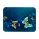 Flying gold, jewellery butterfly on blue textural background. Design with butterflies.