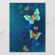 Flying gold, jewellery butterfly on blue textural background. Design with butterflies.