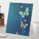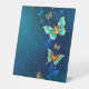 Flying gold, jewellery butterfly on blue textural background. Design with butterflies.