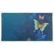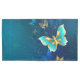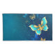 Flying gold, jewellery butterfly on blue textural background. Design with butterflies.