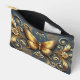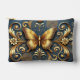 An artistic depiction of an ornate golden butterfly surrounded by elegant floral and ornamental curls on a contrasting blue background, enhancing themes of luxury, elegance, and decor.