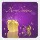 Glamourous magical Christmas illustration: Sparkling golden gift box next to gold and a purple christmas tree balls and golden pearls on an elegant purple bokeh background.