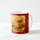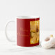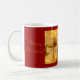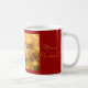 Elegant Christmas mug with golden ornaments and sparkling Christmas lights.