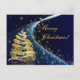 Beautiful post card with golden Christmas tree on deep blue starry background.