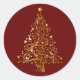 Christmas tree in shades of golden yellow shading to simulate metallic gold. The Christmas tree is comprised of sweeping lines with star ornaments and topped with a gold star. Set on dark Christmas red.