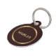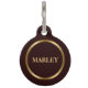 Elegant monogrammed metallic golden circle over brown background. On the other side are the name and phone number on gold background