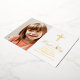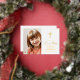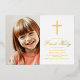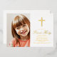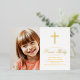 Announce your child's special day with this Minimalist Golden Cross Holy First Communion Photo Real Foil Invitation. The design features real foil Christian golden cross on a clean white background. Your child’s photo is placed beside the event details, creating a modern and elegant layout. Ideal for boys or girls, this invitation is easy to personalize.