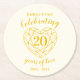 Golden diamond wedding anniversary celebrating 20 years of love party coasters. Simple outline heart stone line art graphics white and golden yellow colour 20th Wedding Anniversary coasters. Customize with your own twentieth wedding party details. The 20th anniversary is associated with yellow or golden diamond and the heart symbolises love. Graphics and design by Sarah Trett for www.mylittleedenweddings.com on zazzle.