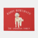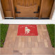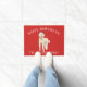 Adorable Christmas doormat featuring a Golden Doodle Dog wearing a santa hat on a festive red background.