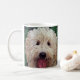 Labradoodle or Golden Doodle with green background on t-shirts, mugs, buttons, magnets, keychains, dog shirts, greeting cards, postage, posters, infant clothing, kids t-shirts, caps, ties, etc. Original art by Keleen