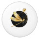 Artistically painted, gold, jewellery, sparkling dragonfly with detailed, filigree wings on golden wild flower, against black textured circle. Golden dragonfly.