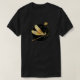 Artistically painted, gold, jewellery, sparkling dragonfly with detailed, filigree wings on golden wild flower, against black textured circle. Golden dragonfly.