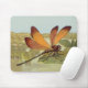 wonderful vintage dragonfly resting on a leaf. the insect has gold and brown tones and the background shows a marsh with water and lilypads.