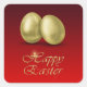 Glamourous illustration with 2 golden easter eggs on a red background.