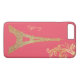 Glam iPhone 7 Plus case, with a glitzy looking gold tone glitter looking silhouette of the Eiffel Tower, against a coral pink background. Personalize the yellow gold text, for yourself or as a great gift idea.