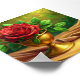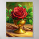 A striking red rose stands elegantly in a golden vase, its vibrant petals exuding passion and beauty. The vase gleams with a warm glow, reflecting light and enhancing the rich colour of the flower. Surrounding the rose are lush green leaves, adding a refreshing contrast to the vivid red. The golden tablecloth beneath creates a luxurious backdrop, shimmering softly and complementing the rose's brilliance. This composition radiates warmth and opulence, evoking a sense of romance and grandeur in any setting.