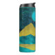 Abstract mountain landscape design in bold shades of gold, cyan,and blue with a moonrise, stars, and birds.