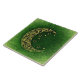 A golden crescent moon in a natural floral pattern with stars over a green backdrop.