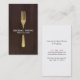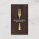 A unique business card showing a faux matte gold fork on the front with your name or business name front and centre. Perfect for catering businesses, personal chefs, food trucks, food writers, restaurants, etc. Set on a dark brown wood background image. © 1201AM CREATIVE