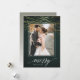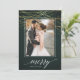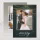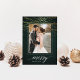 Elegant holiday photo card features a rich hunter green background festooned with faux gold foil light garlands at the top. Add your favourite vertical or portrait oriented photo framed by a white border. "Merry" appears along the bottom in white calligraphy script lettering, with your family name tucked into the design. Personalize the back with three additional photos and a custom Christmas greeting.