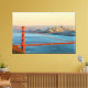 The image showcases the Golden Gate Bridge with the San Francisco skyline in the background. The bridge is a prominent orange structure, with its cables stretching across the blue water. The city skyline is illuminated by the warm light of the setting or rising sun. Several sailboats dot the water, adding to the scenic view. The sky is clear with a gradient of light blue and orange hues.