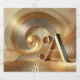This abstract artwork shows curved, golden rainbow shapes that extend harmoniously from a central point. At the bottom there is a concise, stylized golden "A" that rounds off the composition. The soft neutral background color enhances the luxurious gloss of the golden elements, while the soft lighting gives the image a radiant elegance. The modern decor symbolizes refinement and timeless beauty.